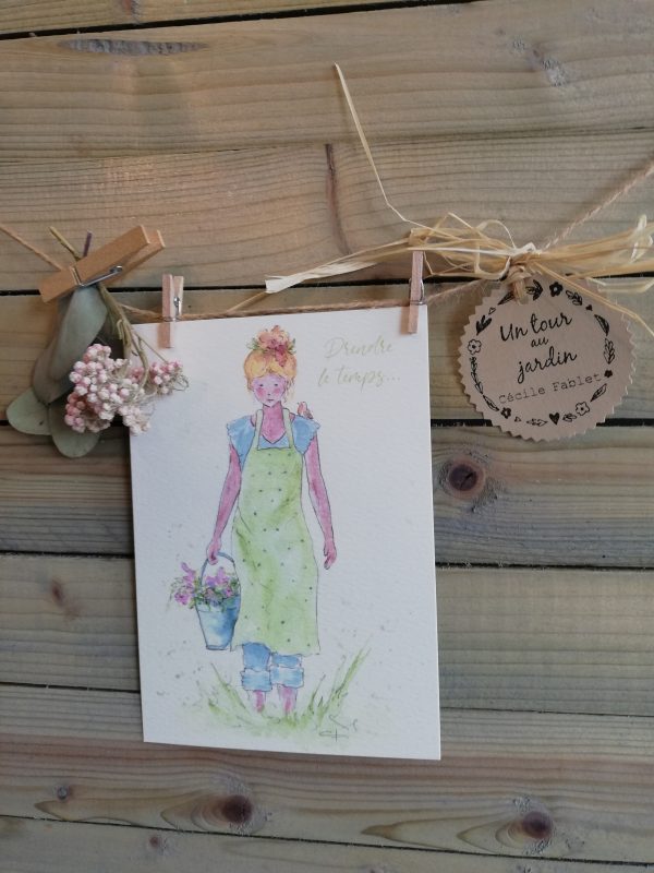Carte postale n°1 “PRENDRE LE TEMPS”, Illustration imprimée d’une aquarelle réalisée par mes soins (105mmx148mm), libre à vous d’envoyer cette jolie carte à quelqu’un avec un petit mot ou de l’afficher au dessus de votre bureau. (livrée avec une enveloppe 114mmx162mm)
