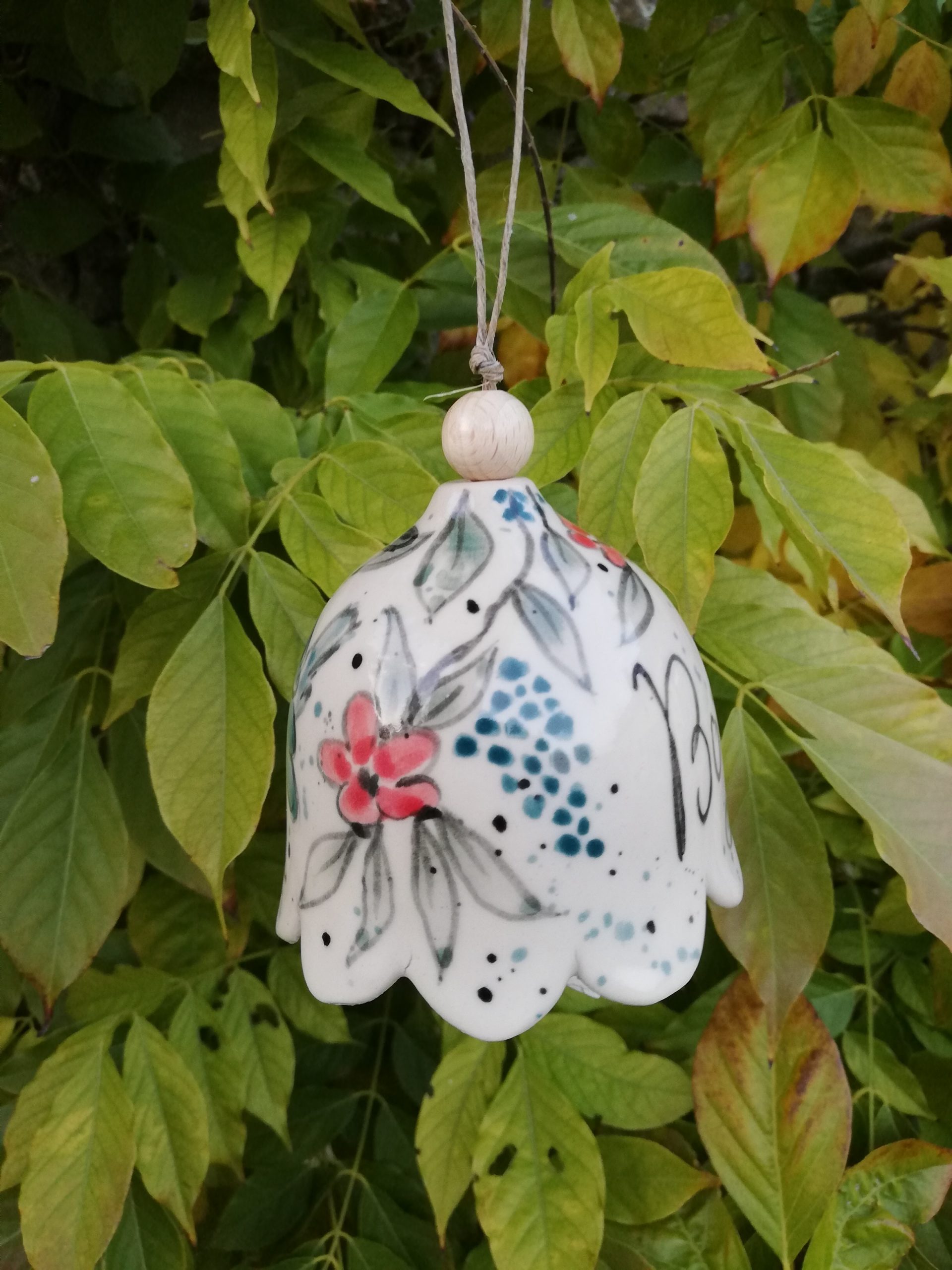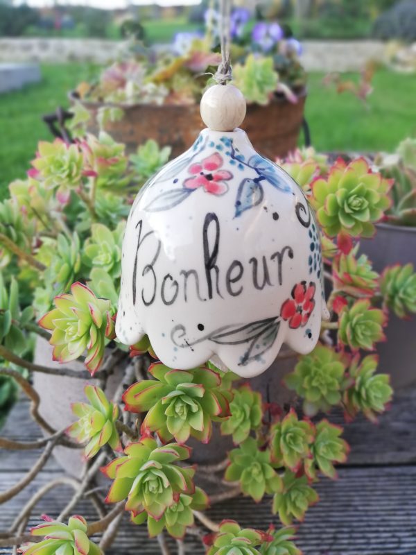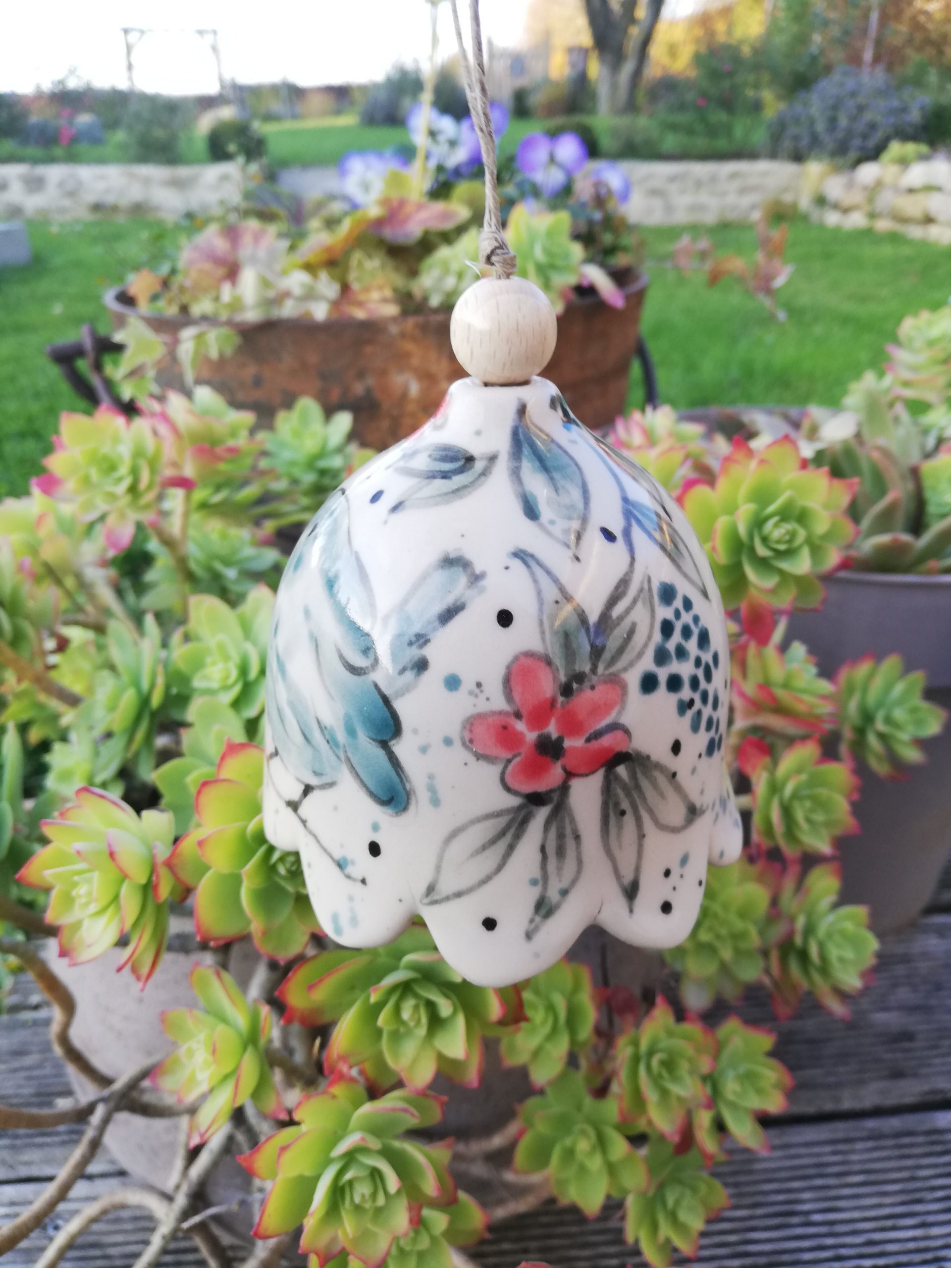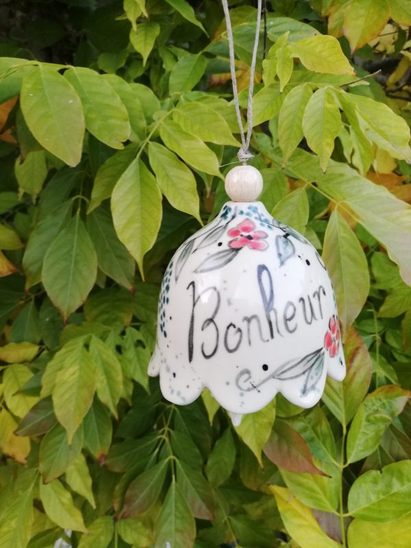 Petite clochette de jardin en grès non gélif, Collection Céramic Bells, réalisée au tournage et décorée à la main (petite étoile en dessous )