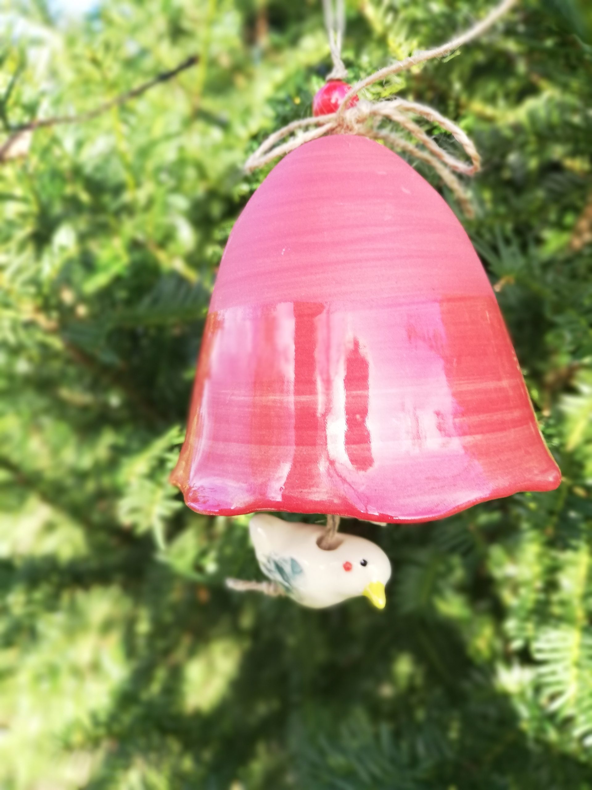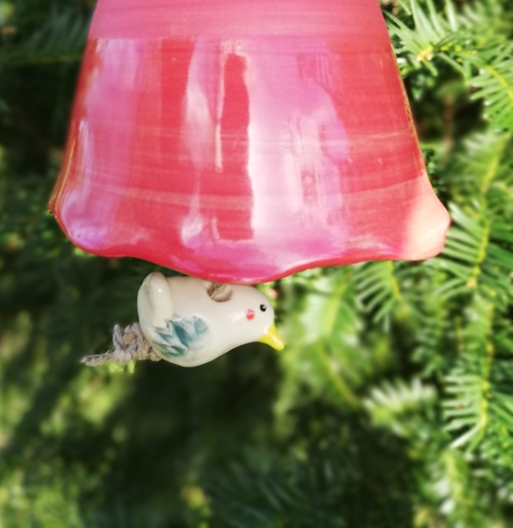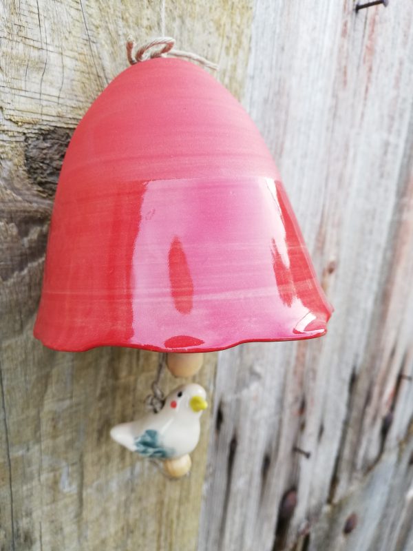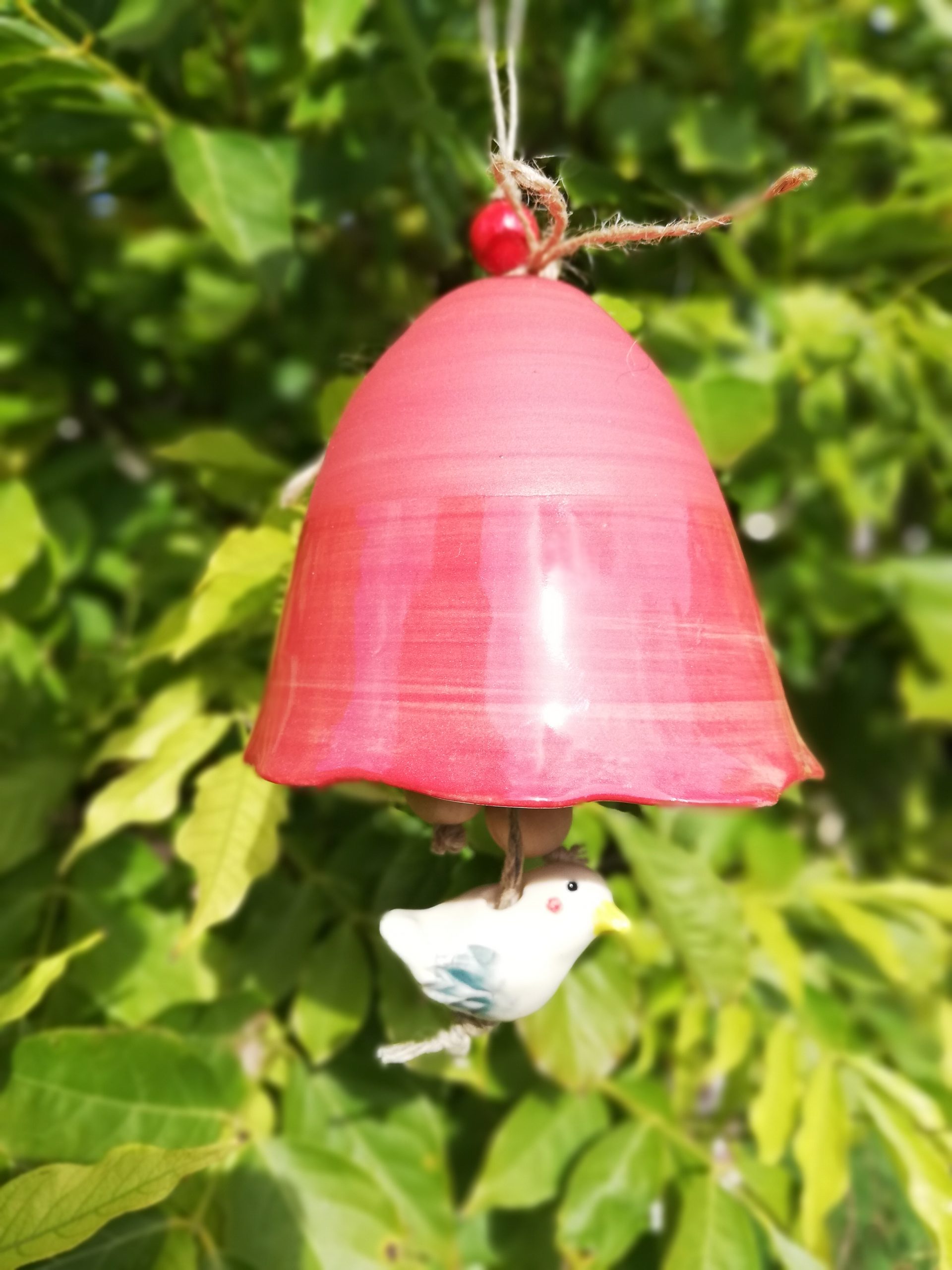 Clochette de jardin en grès non gélif, collection Céramic Bells, réalisée au tournage et décorée à la main, petite sculpture d’oiseau en dessous réalisé à la main, pièce unique.