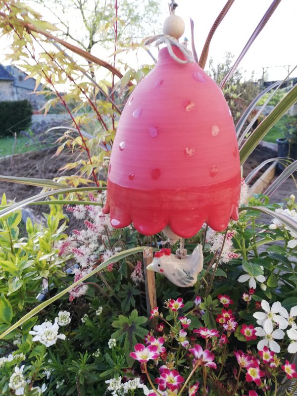 Cloche décorative de jardin en grès non gélif (H10cm L10cm), belle sonorité avec petite poule en dessous, , tournée, décorée et sculptée entièrement à la main. pièce unique.