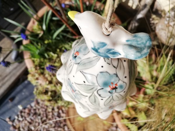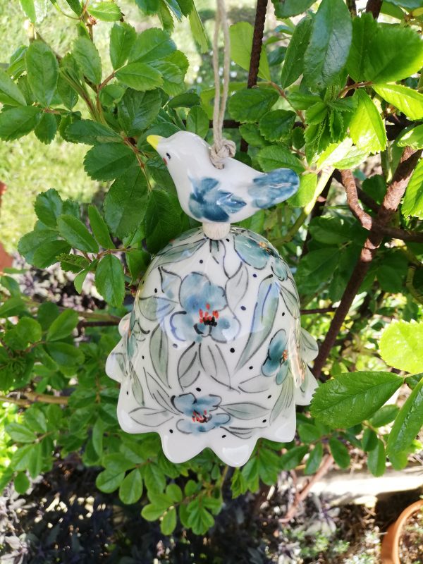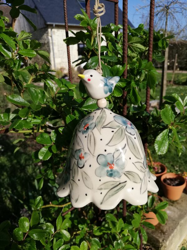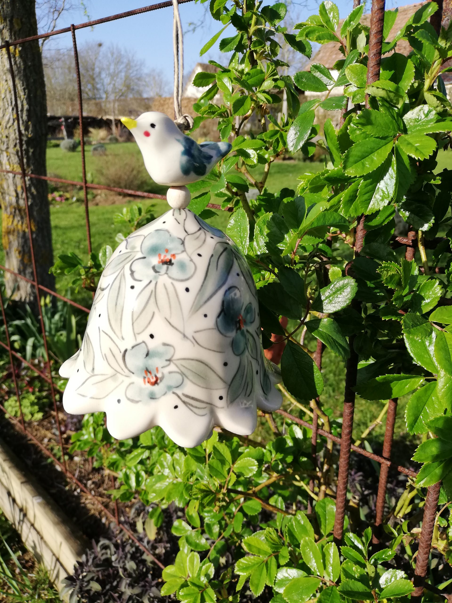 Cloche décorative de jardin en grès non gélif (H9cm L9cm) belle sonorité avec une petite colombe en dessous, pièce tournée, décorée et sculptée entièrement à la main, pièce unique.