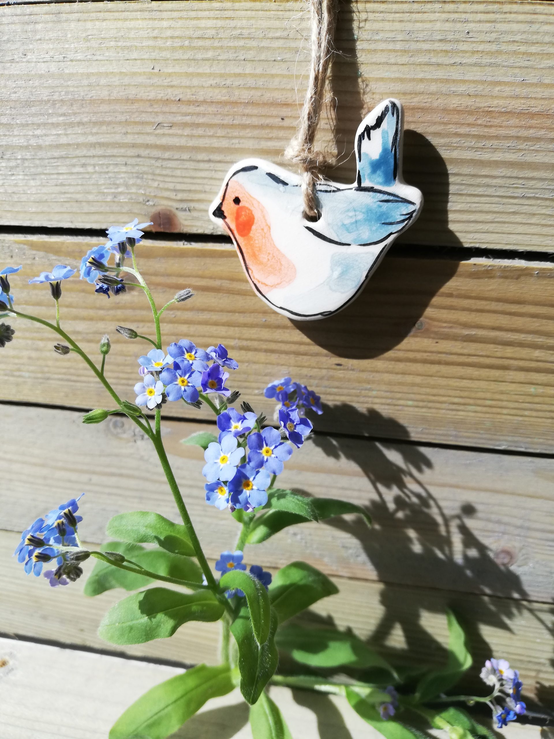 Adorable petit oiseau décoratif appelé “L’esprit d’un tour au jardin”  en faïence,  à accrocher partout où il vous plaira. Pièce réalisée et décorée à la main. (4,5 cm x4,5cm)