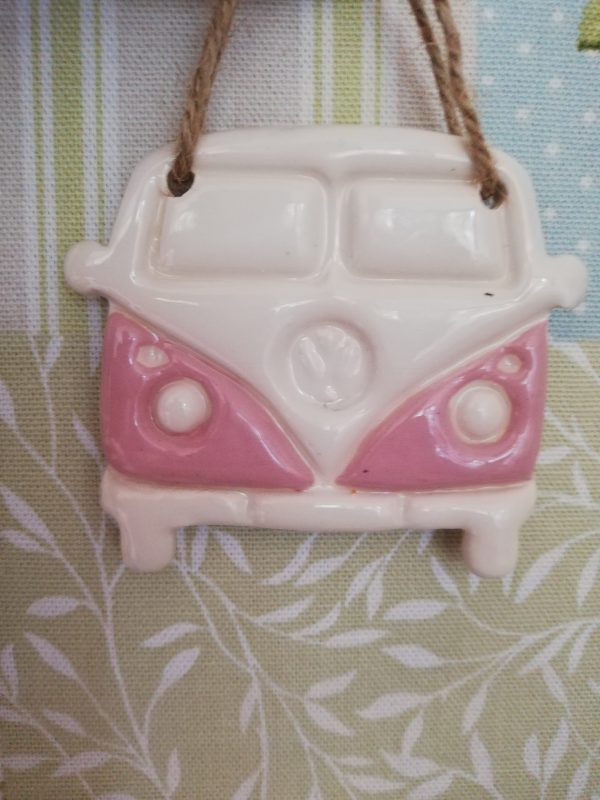 Petit van décoratif en céramique (faïence ) couleur rose, à suspendre, pièce unique entièrement réalisée à la main.